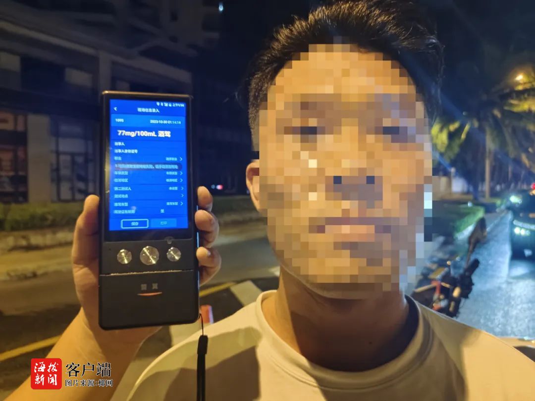 据了解,10月29日凌晨,执勤交警依法拦截一辆车牌号为琼B9**AT的黑色轿车,经现场呼气式酒精测试仪检测,驾驶人梁某忠(男,35岁)现场呼气检测酒精含量为77mg/100ml,属于饮酒后驾驶机动车。在进一步核查驾驶人信息时,交警执勤队员发现驾驶人梁某忠并未取得机动车驾驶证,即存在“无证”和“酒驾”两项交通违法行为。