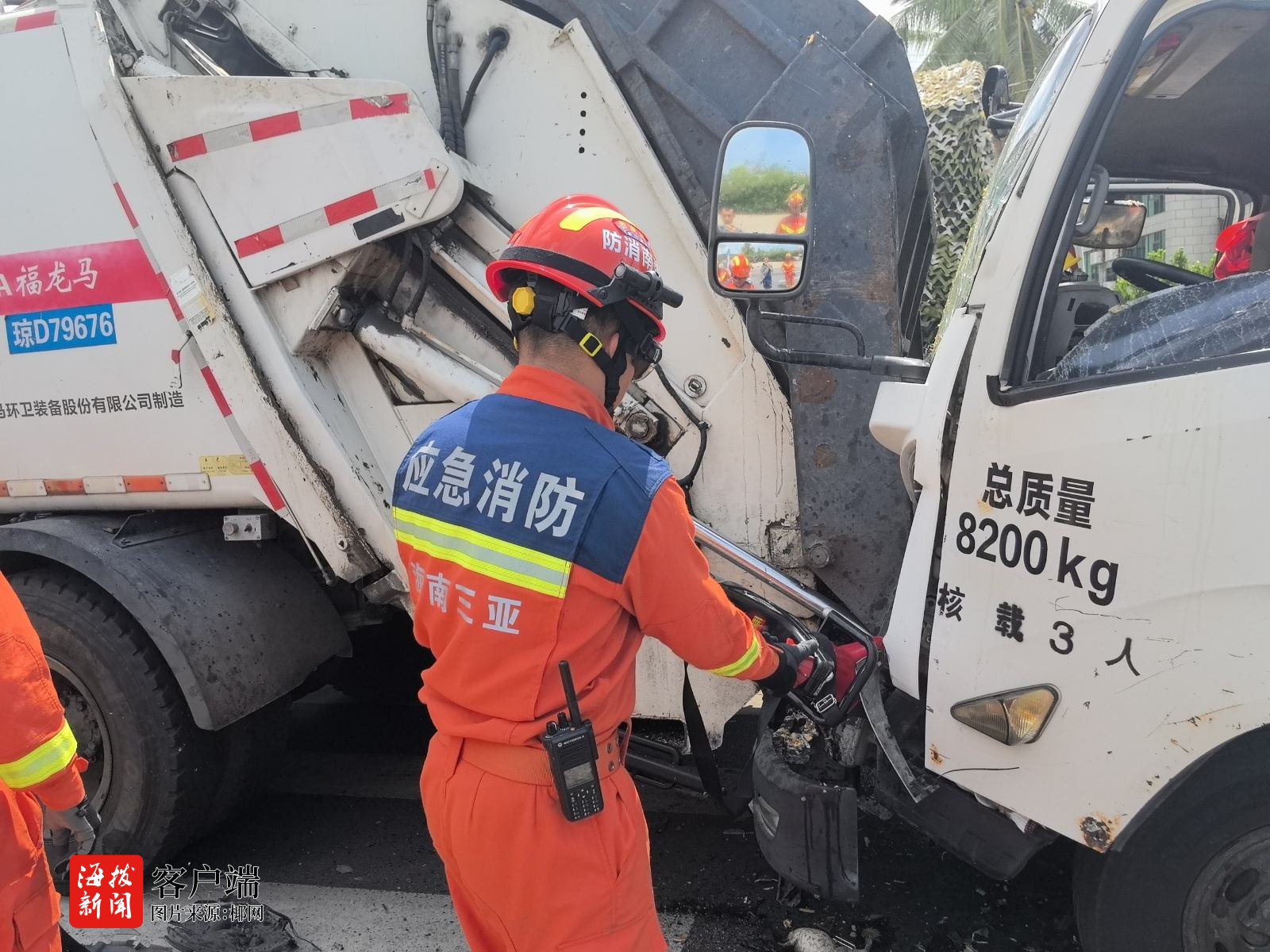 5月7日10时24分左右,三亚市天涯区水蛟小学附近3辆环卫车发生车辆追尾事故,其中1人被困。接到报警后,三亚消防立即调派救援力量赶赴现场处置,成功救出被困者。
