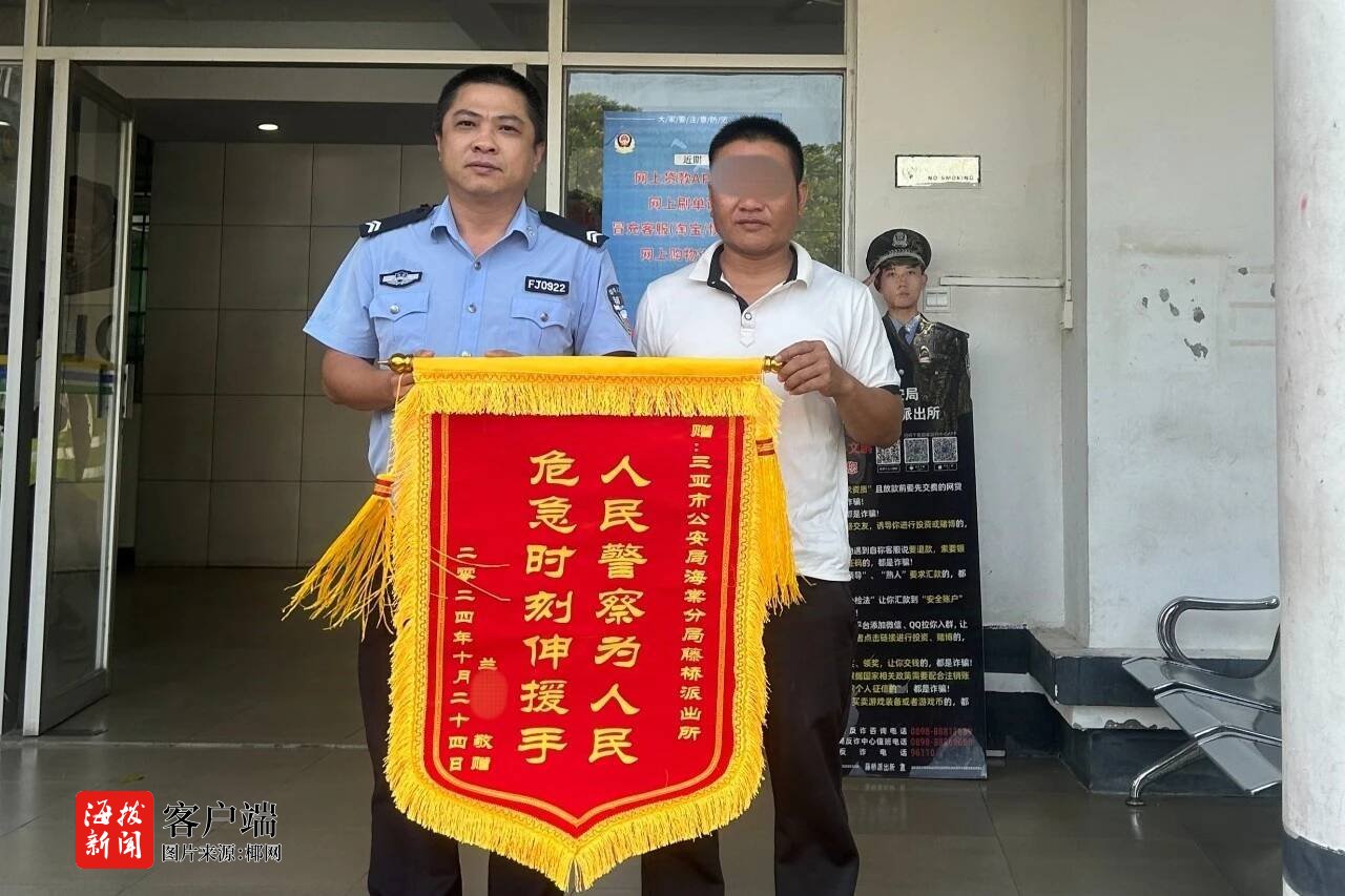 “感谢三亚人民警察为人民,非常感谢你们!”10月24日上午,刚出院不久的兰先生将一面印有“人民警察为人民,危急时刻伸援手”的锦旗送到三亚市公安局海棠分局藤桥中心派出所,对辅警纪博伟、刘传祺紧急护送其就医表示感谢。
