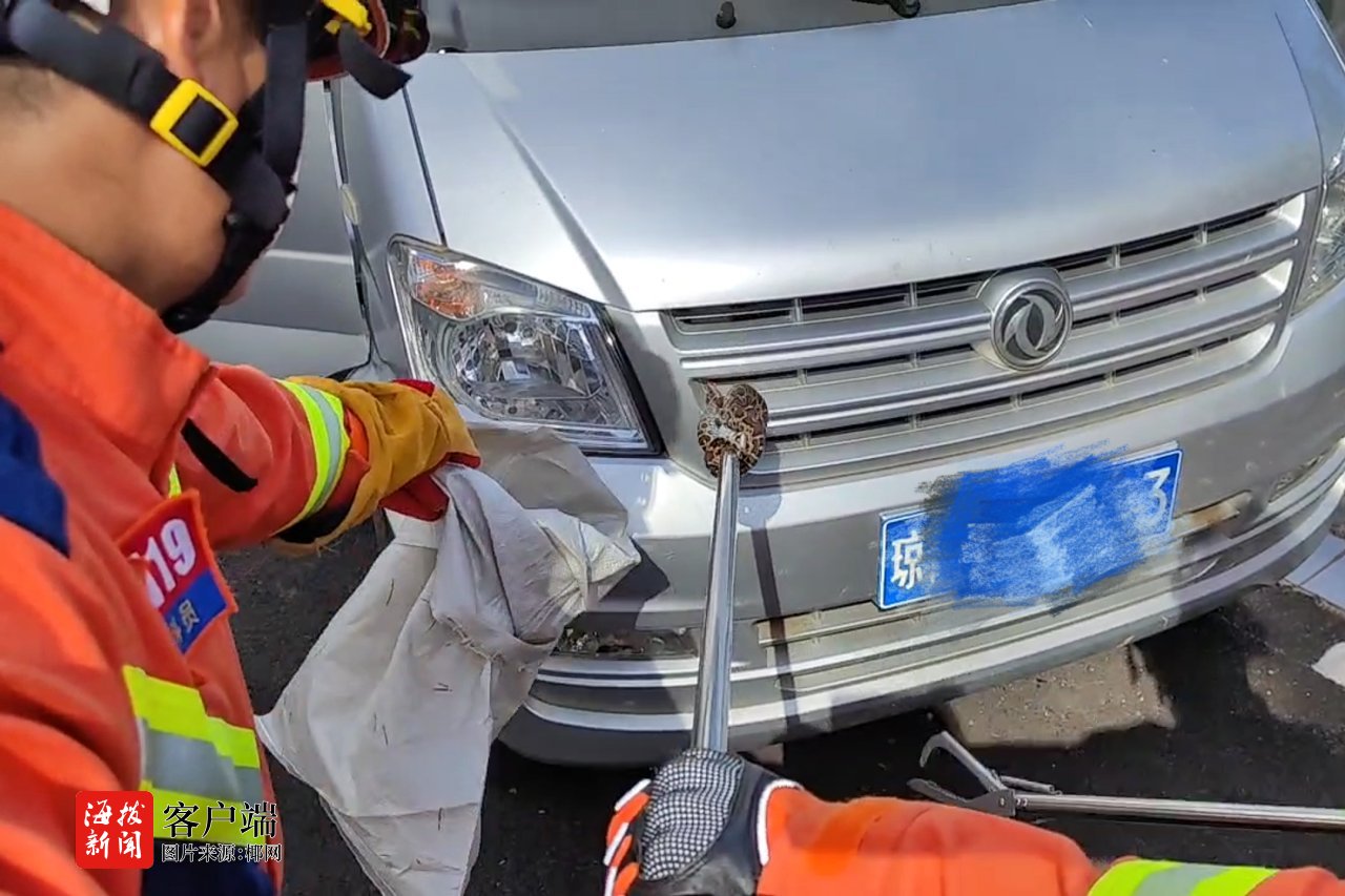 8月9日下午,洋浦经济开发区瑞洋路一小区一辆小货车内钻入一条约1米长的蟒蛇。洋浦消防赶到现场后发现,因为受到惊吓,蟒蛇躲进了引擎盖里。经过不到1分钟的“捕蛇游戏”,消防人员成功将蟒蛇制伏。