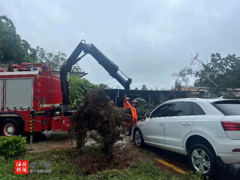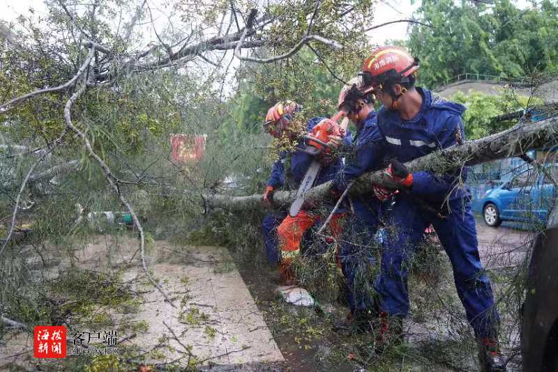 7月22日上午,受第4号台风“派比安”影响,海南洋浦的瞬时风力达到8级,一棵大树被大风连根拔起,倾倒后砸到了多部车辆。接到报警后,洋浦消防员立即赶到现场处置。