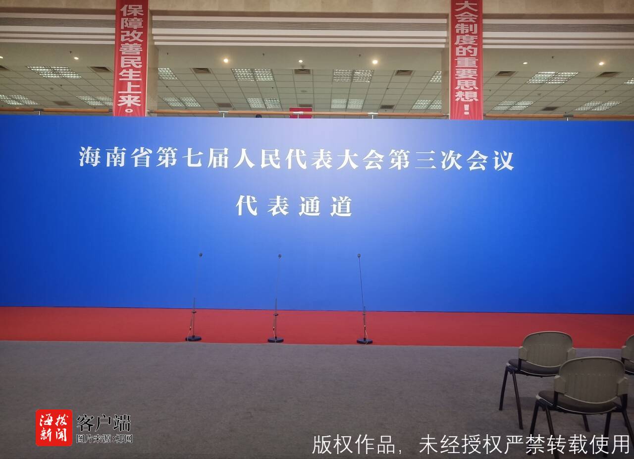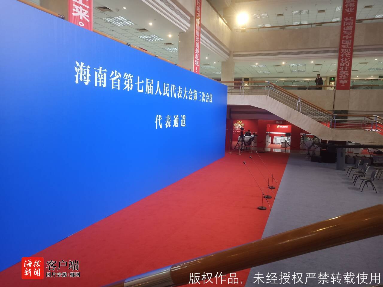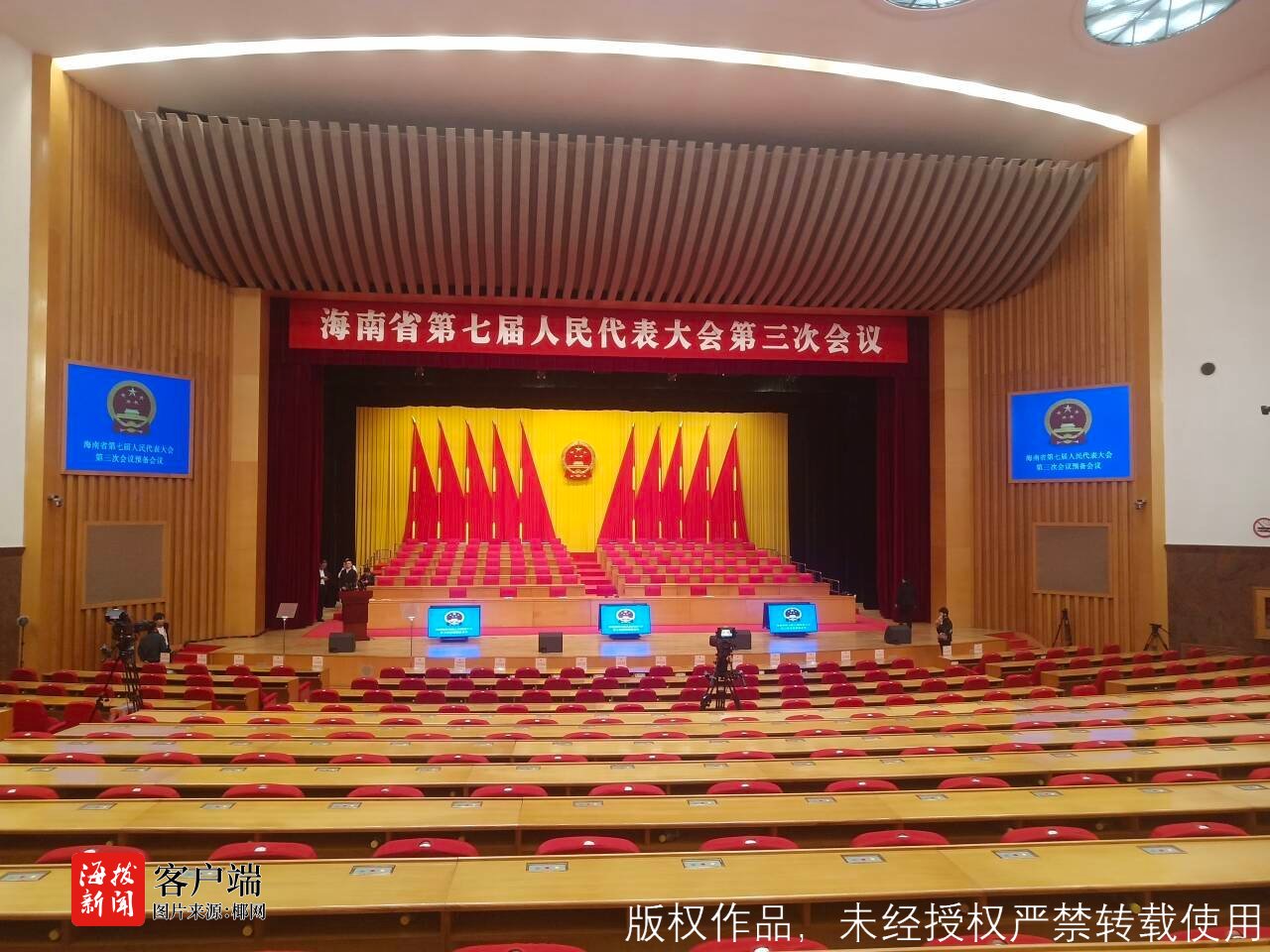 海南省第七届人民代表大会第三次会议是在海南全面深化改革开放和自由贸易港建设的关键时期召开的一次大会,是全省人民政治生活中的一件大事。在省人大会堂里,会场布置已经完成,省人大会堂上方的“海南省第七届人民代表大会第三次会议”的条幅庄严醒目,电子签到设备、表决器等也已经调试完成,会场整洁、明亮。