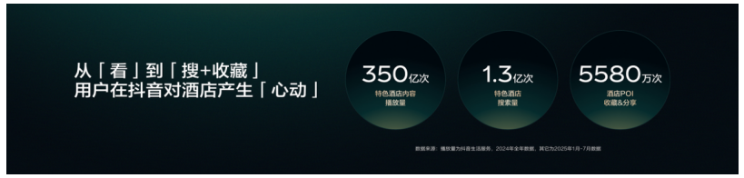 数据显示,过去一年,抖音上“特色生活方式酒店”相关内容播放量超过350亿次。今年1月至7月,抖音用户对“特色酒店”进行了1.3亿次搜索,酒店POI收藏与分享达5580万次。这意味着,越来越多用户习惯在抖音“找酒店、看酒店、选酒店”,抖音已成为生活方式酒店释放增长潜力的新场域。