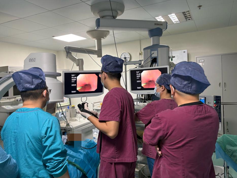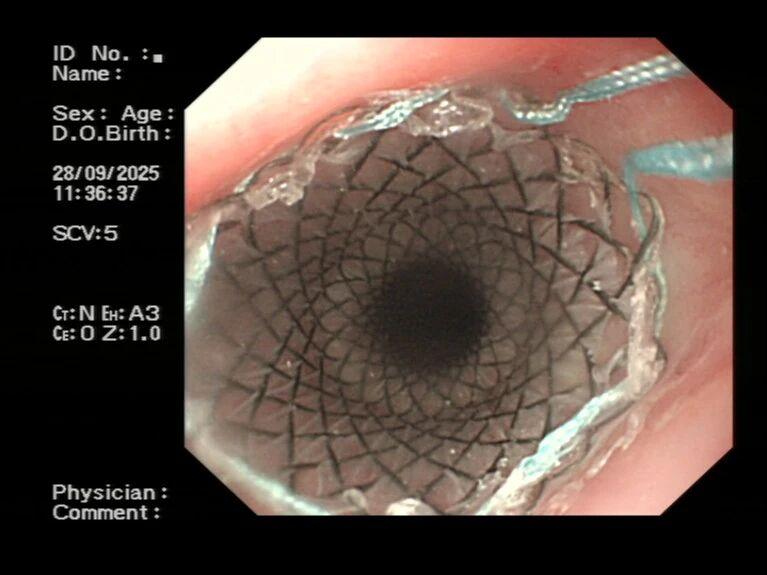 手术当日,在毛苇主任医师的精细操作下,消化内镜中心主治医师邝继孙、黄永华及黄杏护士密切协作,将一枚全覆膜食管支架精准输送至食管狭窄段并成功释放。支架迅速膨胀,有效撑开了被肿瘤严重压迫的食管管腔,被堵塞多时的“生命通道”终于被重新打开。术后患者生命体征平稳,恢复良好,当日即可进食流质,生活质量得到显著改善,目前已顺利出院。