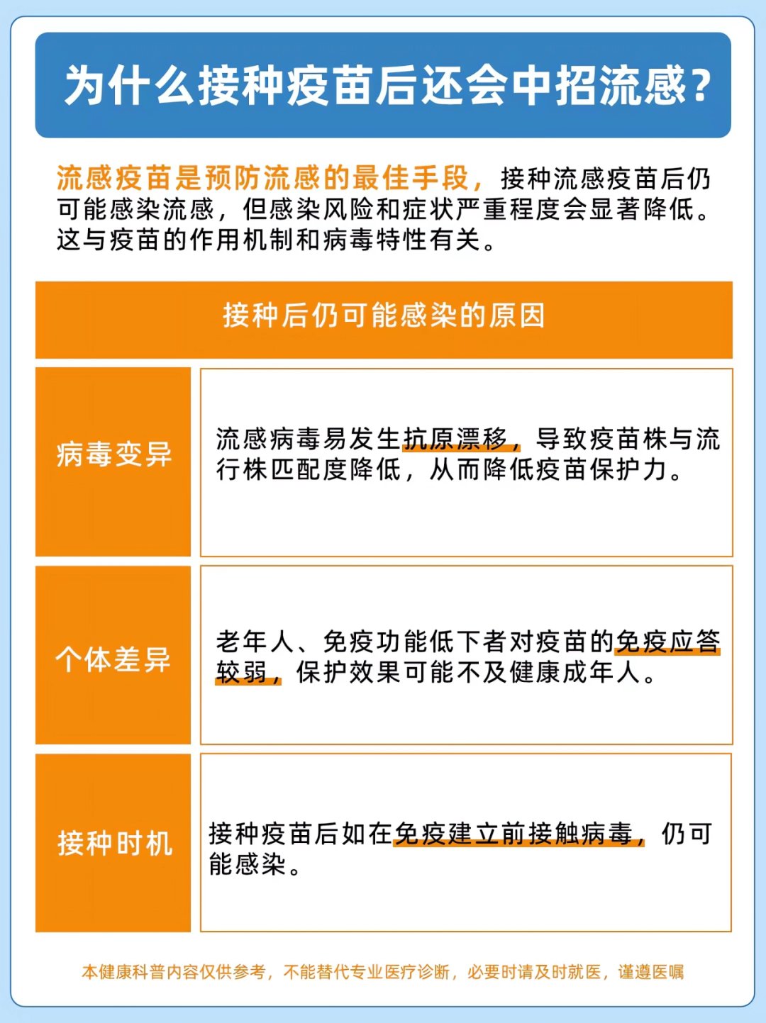 很多人会有一个疑问:“明明接种了流感疫苗,怎么还会感染流感?”其实,接种疫苗后仍可能感染,但感染风险会降低60%以上,且感染后症状更轻(多为低热、轻微乏力)、病程更短(通常3—5天),发展为重症的概率大幅下降,这已经是疫苗带来的重要保护。