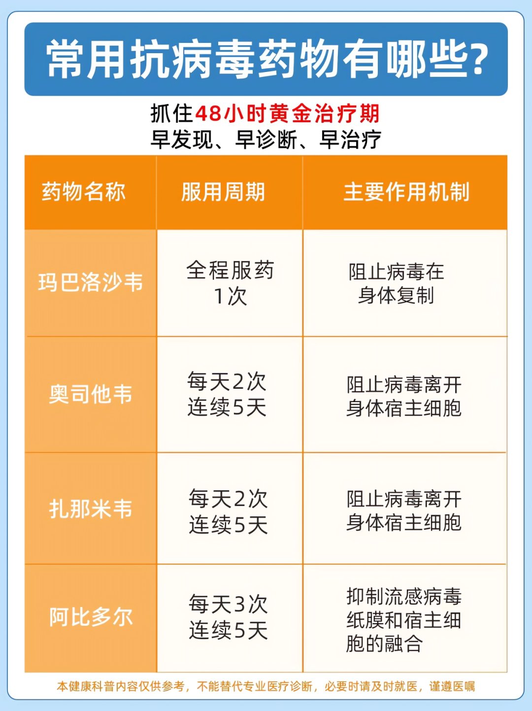 如果不幸感染流感,及时规范治疗能有效缓解症状、缩短病程,甚至降低并发症风险。其中,发病48小时内是抗病毒治疗的黄金期,抓住这个时机用药,效果会更明显。
