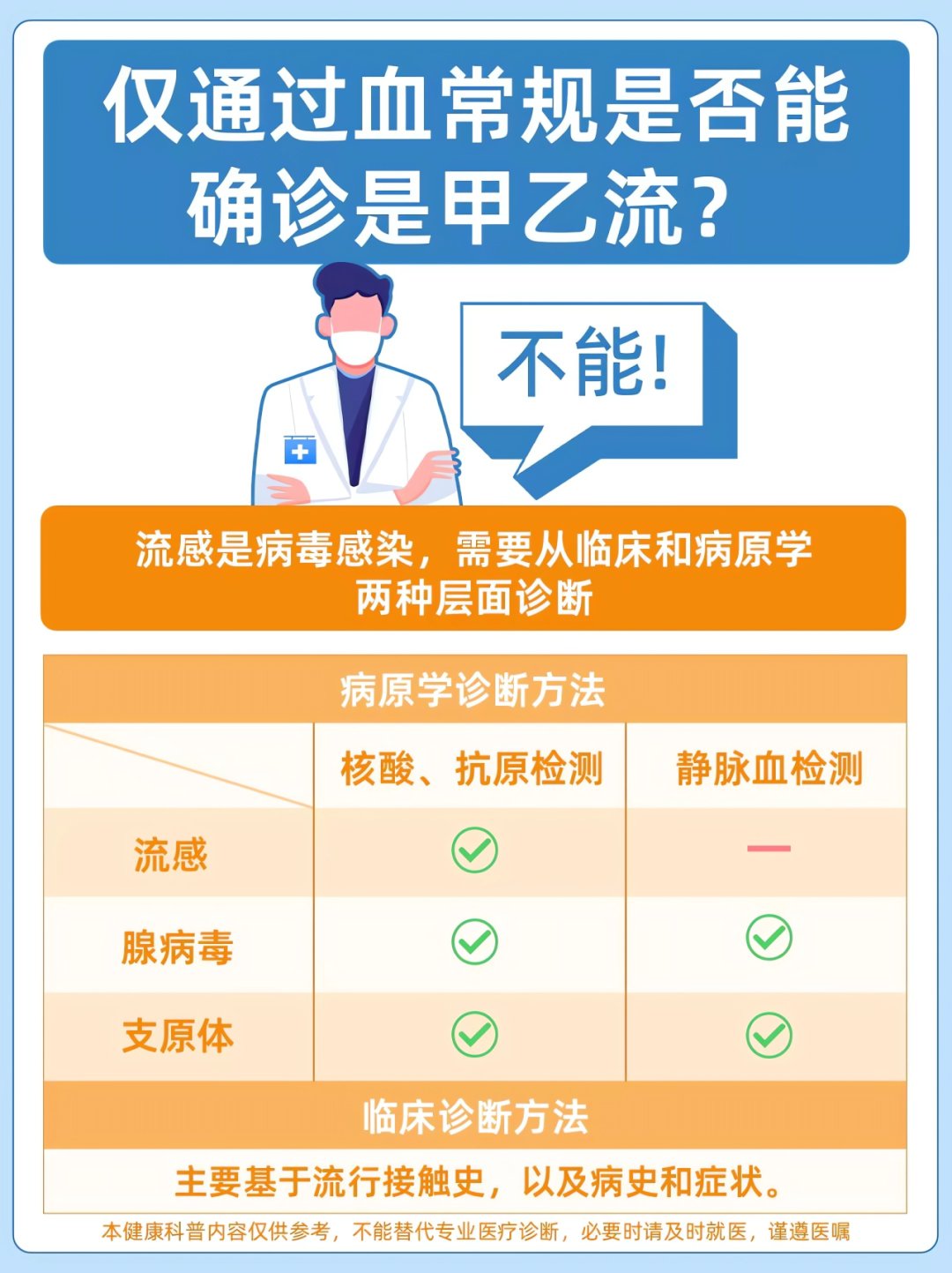 很多人认为“查个血常规就能确诊流感”,但很多人存在一个误区:认为“查个血常规就能确诊流感”,其实这种认知并不准确——仅通过血常规无法确诊甲乙流。流感是病毒感染,诊断需要结合“临床”和“病原学”两个层面综合判断。