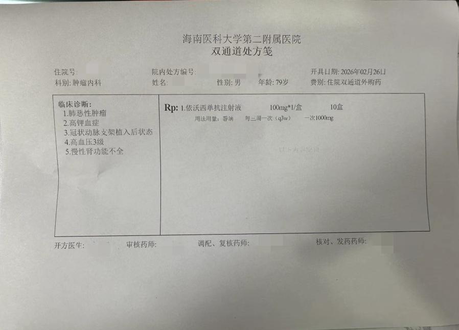 在海南医科大学第二附属医院(以下简称“海医二院”)住院治疗的肺癌患者王大爷,如今再也不用为用不上新药、报销来回跑而发愁。依托医院最新打通的住院“双通道”服务,他在病区内就完成了国谈创新药的处方流转与医保即时结算,个人仅需支付349.6元,真正实现了“住院期间一站式享受医保政策福利”。