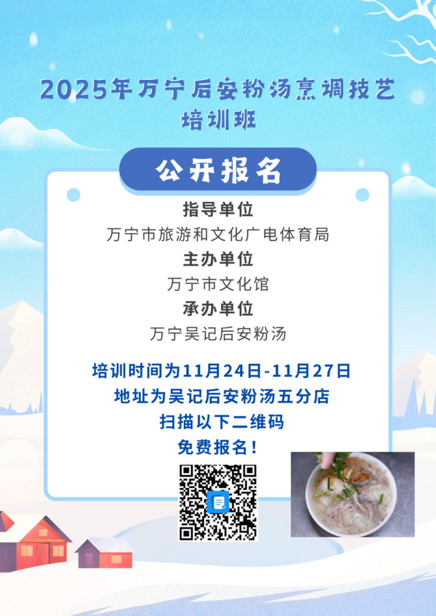 为传承和弘扬后安粉汤文化,培养优秀人才,由万宁市文化馆主办,万宁吴记后安粉汤承办的2025年万宁后安粉汤烹调技艺培训班,定于11月24日至27日在吴记后安粉汤五分店举办,活动为期四天,前三天为课程培训,最后一天为公益品尝展示(自愿参加)。