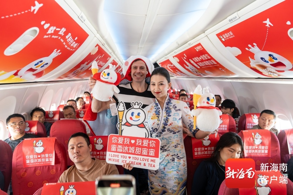 主题航班活动丰富多彩,乘务员与旅客进行趣味互动,"你爱我,我爱你,蜜雪冰城甜蜜蜜"的经典旋律在机舱回荡,答对问题的旅客获得了蜜雪冰城礼品卡,整个旅程充满欢乐气氛。