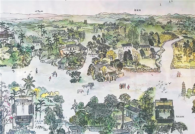 卢家福绘国画《珠崖风景水南村》局部。海南日报全媒体记者 陈耿 翻拍