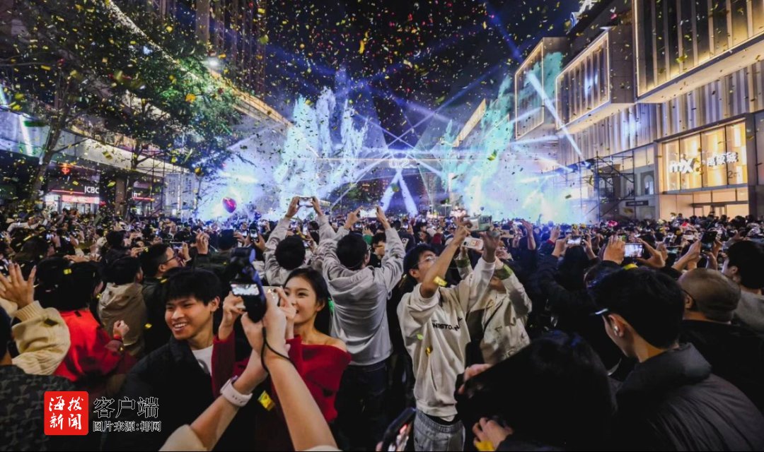 事实上,当天除了在五源河体育场第四次举办的2024-2025湖南卫视芒果TV跨年晚会(以下简称湖南芒果跨年晚会),以及在万绿园举办“夸下海口”2025年跨年草坪音乐会之外,海口还有国潮城、高兴里特色商业文化街区、新海港、友谊·南海城等15个点位都举办了各式各样的跨年活动。