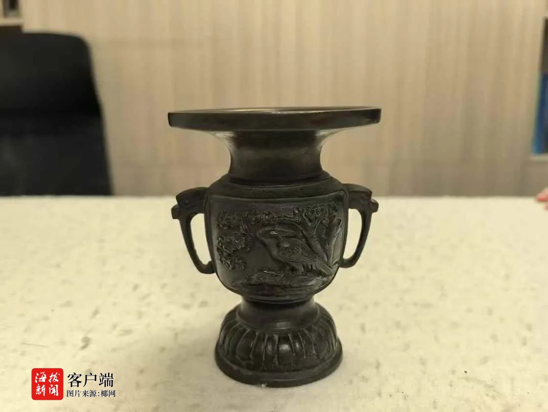 为核实真伪,确认该物品的具体属性,海关工作人员将该物品送至国家文物进出境审核海南管理处委托鉴定。国家文物进出境审核海南管理处第一时间组织专业人员对该物品进行鉴定,确认其为清末民国时期的花鸟纹铜觚,属于国家禁止出境的一般文物。