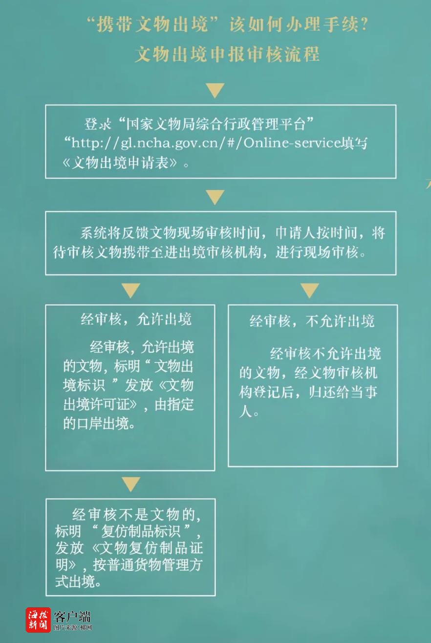 国有文物、非国有珍贵文物、国家规定禁止出境的文物不得出境。如需文物出境,在文物出境前填写文物出境申请表,报国务院文物行政部门指定的文物进出境审核机构审核。经审核允许出境的文物,由国务院文物行政部门发给文物出境许可证,标明文物出境标识,从国务院文物行政部门指定的口岸出境。任何单位或个人邮寄、携带文物出境,应当向海关申报;海关凭文物出境许可证放行。经审核不允许出境的文物,由文物进出境审核机构发还当事人。