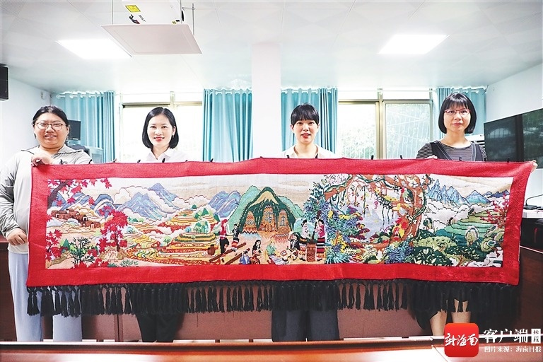 五指山市工作人员展示壁挂式黎锦作品《四季同辉·巾帼逐梦》。五指山市民族事务局供图