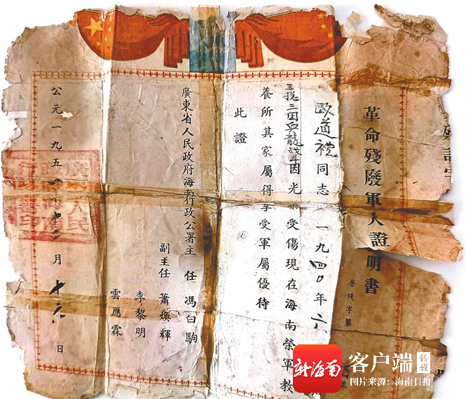 欧道礼的残疾军人证书。本组图片由红色娘子军纪念馆提供