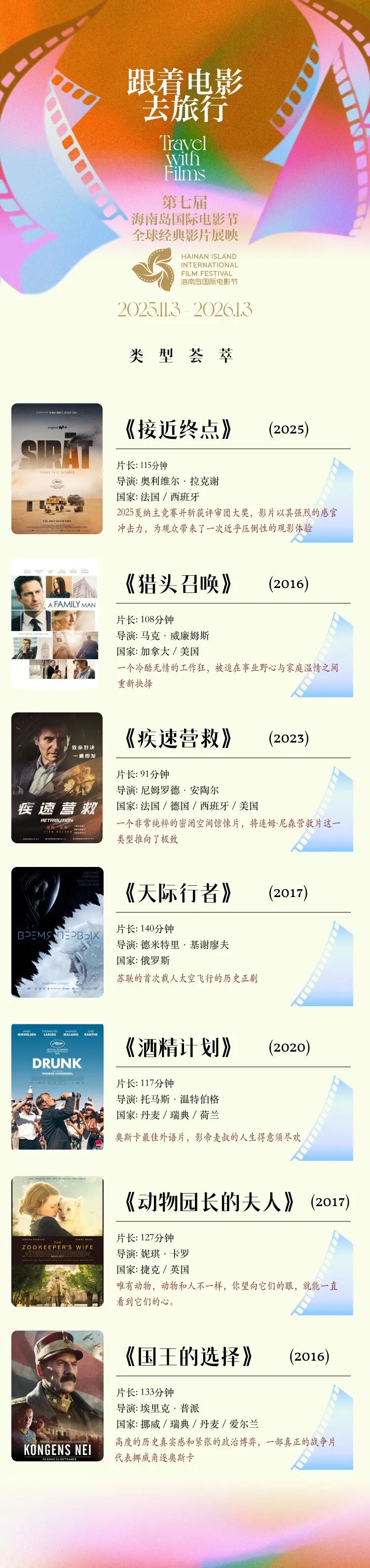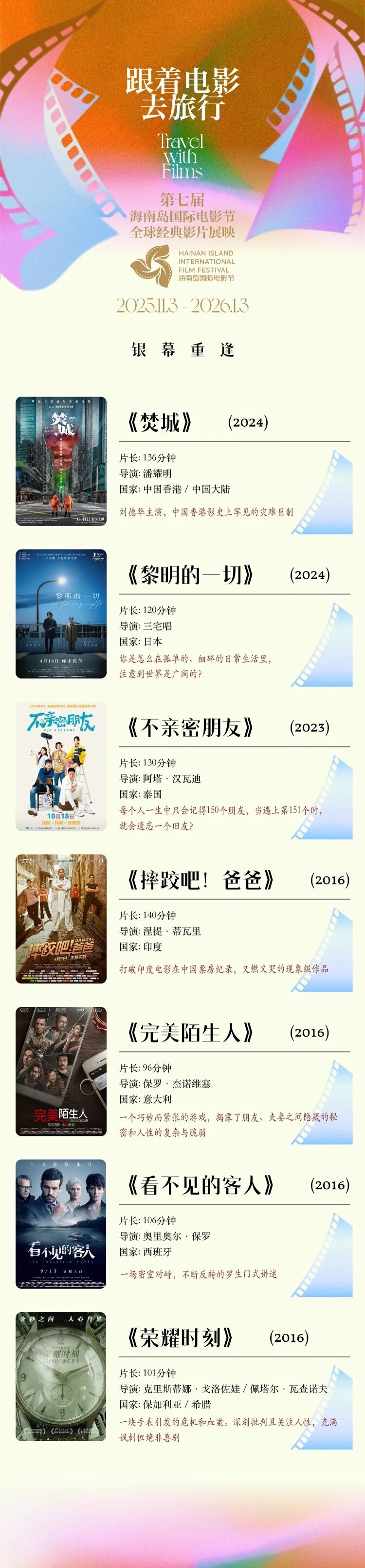 第七届海南岛国际电影节将于2025年12月初在三亚举办。本届电影节除主体活动外,特别策划“跟着电影去旅行”全球经典影片展映,以三亚、海口为双城据点,串联城市与海岸,在椰风海韵间交织电影艺术之光。