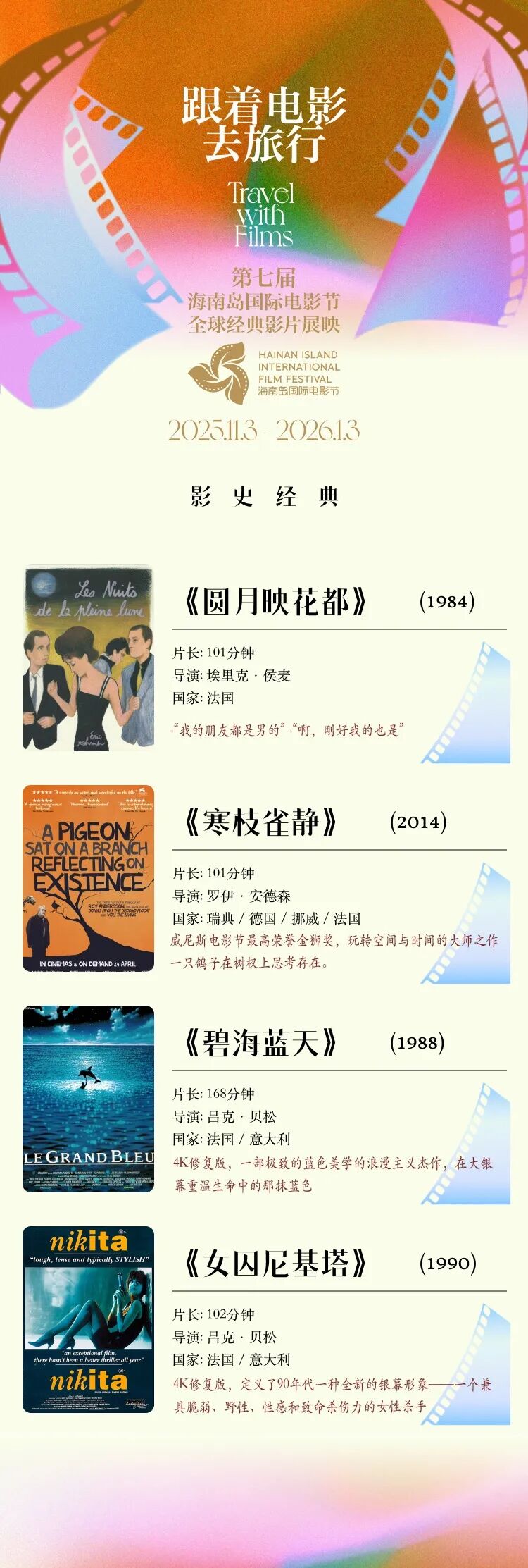 此次展映共设五大单元,精选来自21个国家及地区的30余部佳作,呈现当代影像的多元潮流。提前展映(11月3日至12月2日)涵盖“银幕重逢”“影史经典”“类型荟萃”三大单元;延后展映(12月14日至2026年1月3日)则设有“海影惊喜”与“影海观澜”单元。观众将有机会重温吕克·贝松执导的《碧海蓝天》《尼基塔》,亦可欣赏荣获今年戛纳电影节评审团奖的《接近终点》等影片。
