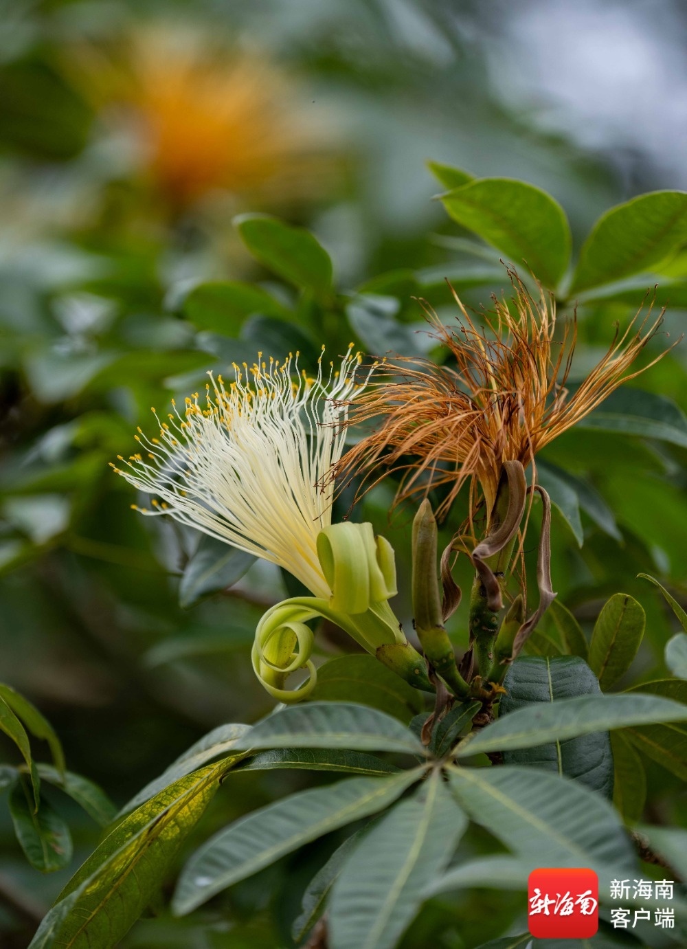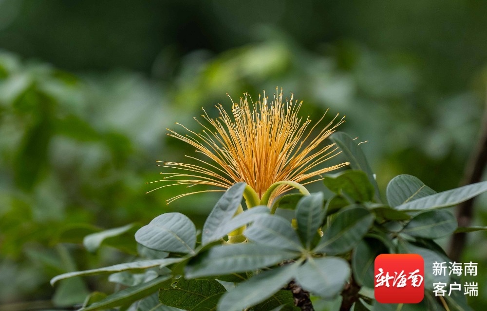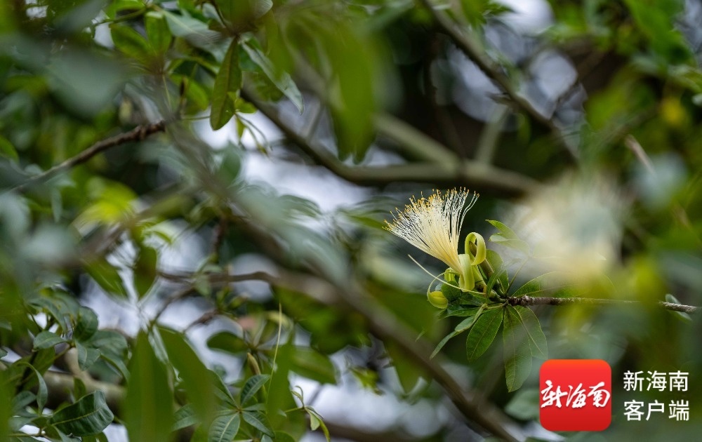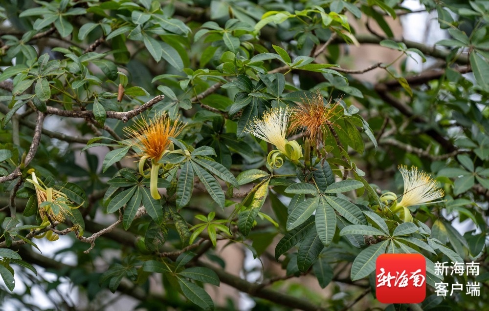 近日,海南澄迈保良古村的一株成年马拉巴栗树(俗称发财树)惊艳绽放,串串金褐相间的花穗,状若缀满珍珠的流苏,柔润花瓣层层舒展如蝶翼轻振,花蕊凝露带香,与青碧饱满的幼果相映成趣。