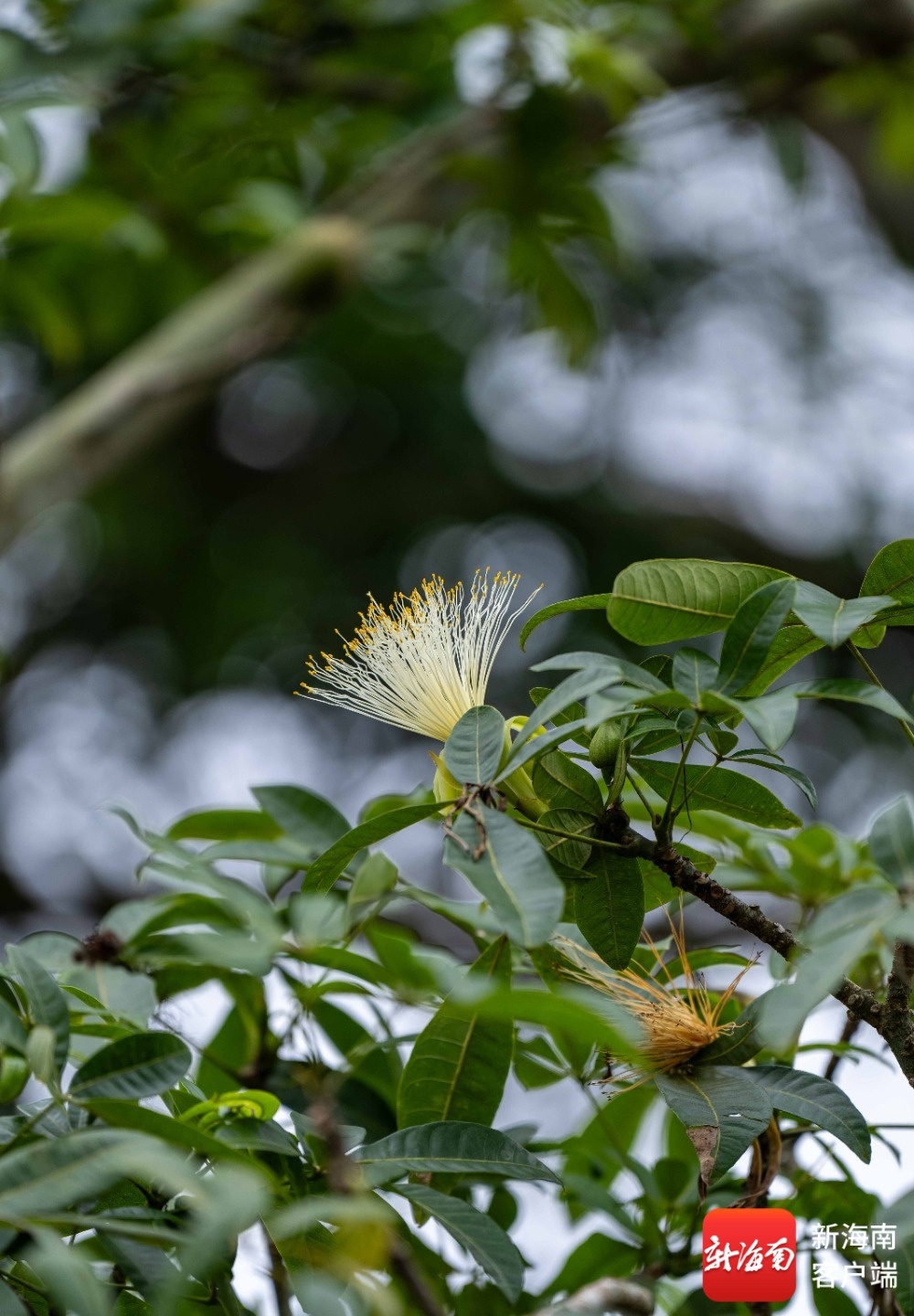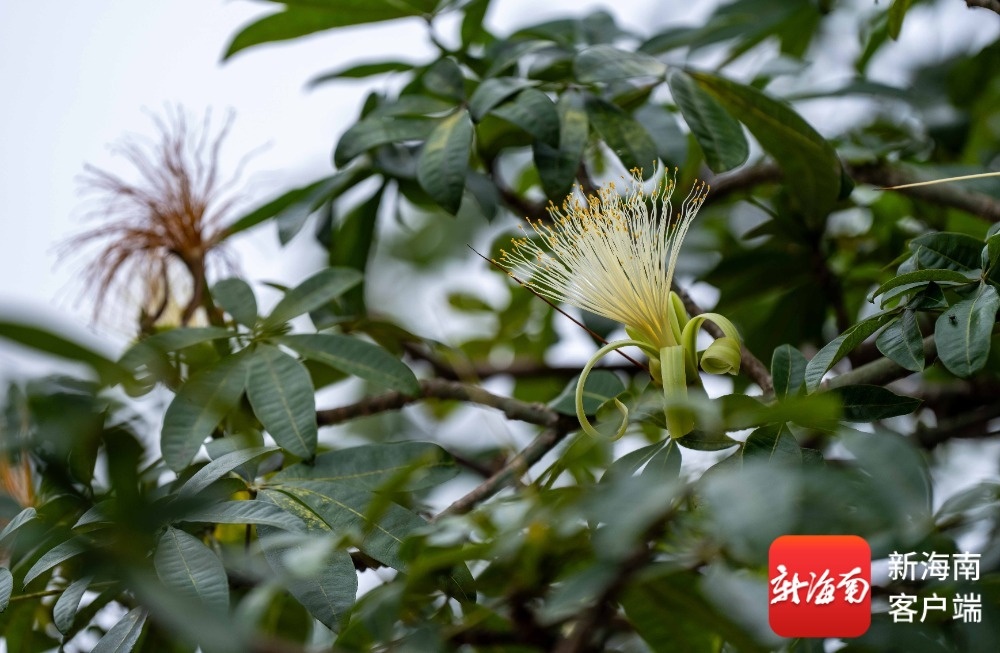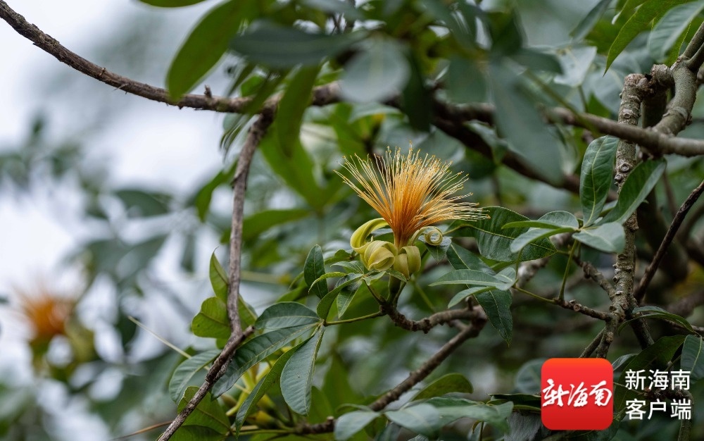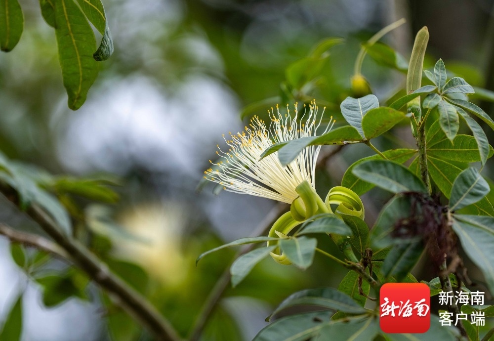 近日,海南澄迈保良古村的一株成年马拉巴栗树(俗称发财树)惊艳绽放,串串金褐相间的花穗,状若缀满珍珠的流苏,柔润花瓣层层舒展如蝶翼轻振,花蕊凝露带香,与青碧饱满的幼果相映成趣。