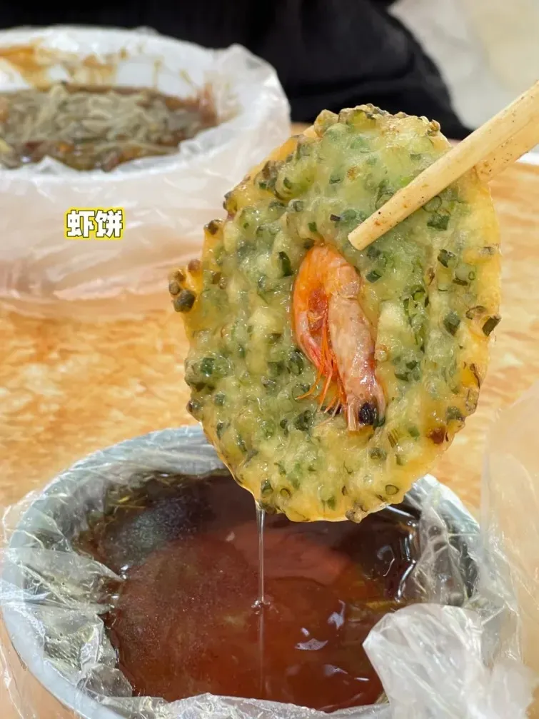 虾饼又称虾粿,是东方的传统小吃,新鲜出锅的虾饼蘸着秘制的醋,一口入魂!