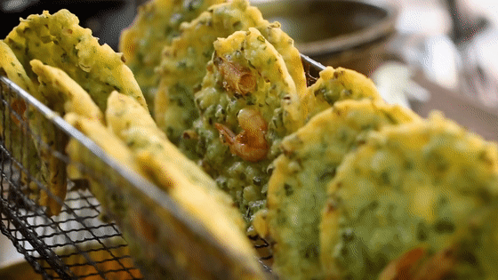 和临高用韭菜搭配的做法不同,八所虾饼用的是葱花和小虾,小虾更易炸脆,加上浓郁的葱香味,可以大口吃下都不留渣。