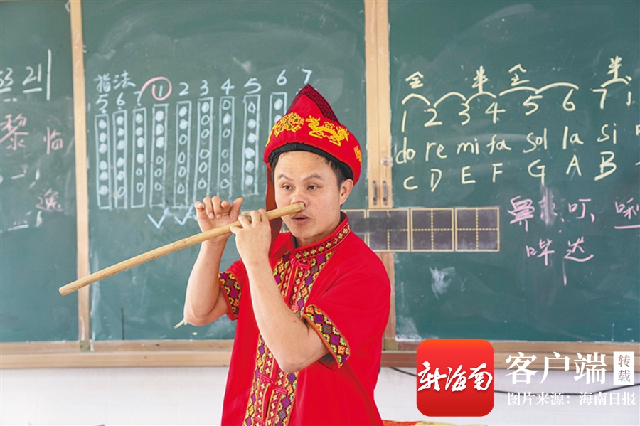 “祖传的技艺不能丢,这是我们黎族的文化。”带着这样的信念,近些年,朱非走进学校、村庄传授竹木器乐。他曾受邀前往三亚,教村民吹奏鼻箫;还主动参与五指山市“非遗进校园”活动,站上小学、初中、高中音乐课的讲台。