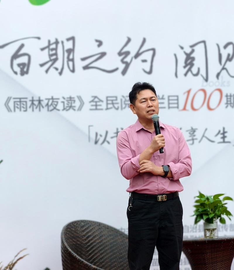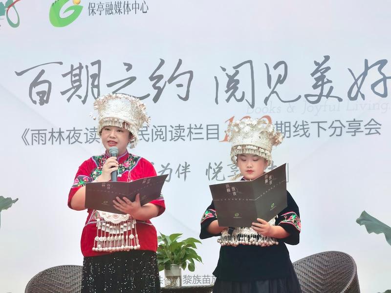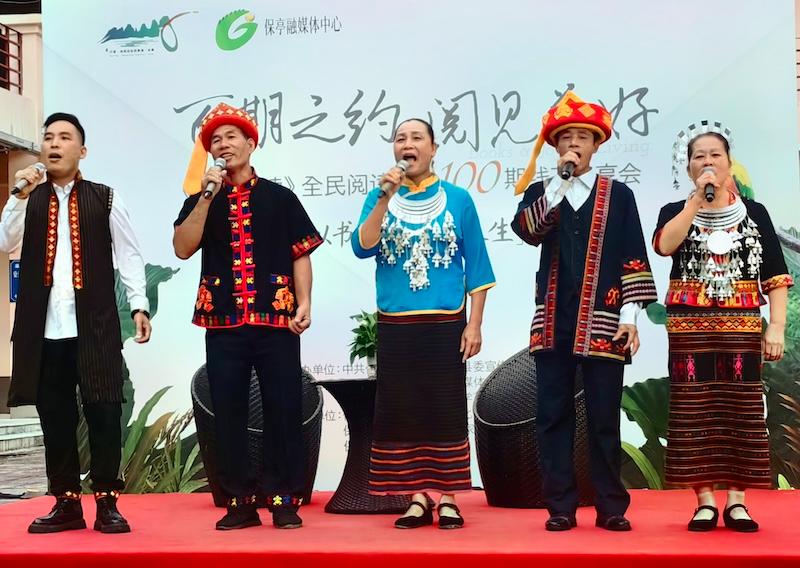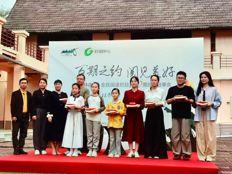 活动现场还设置了多项特色环节:主办方为8位“百期活跃粉丝”颁发了奖状与书籍,4位粉丝代表分享了与《雨林夜读》的不解之缘;“对古诗”“共阅读”等互动游戏环节中,听众踊跃抢答,获胜者收获了保亭文创礼品;最后,全体人员齐唱《歌唱祖国》,在激昂的旋律中为本次百期分享会画上圆满句号。