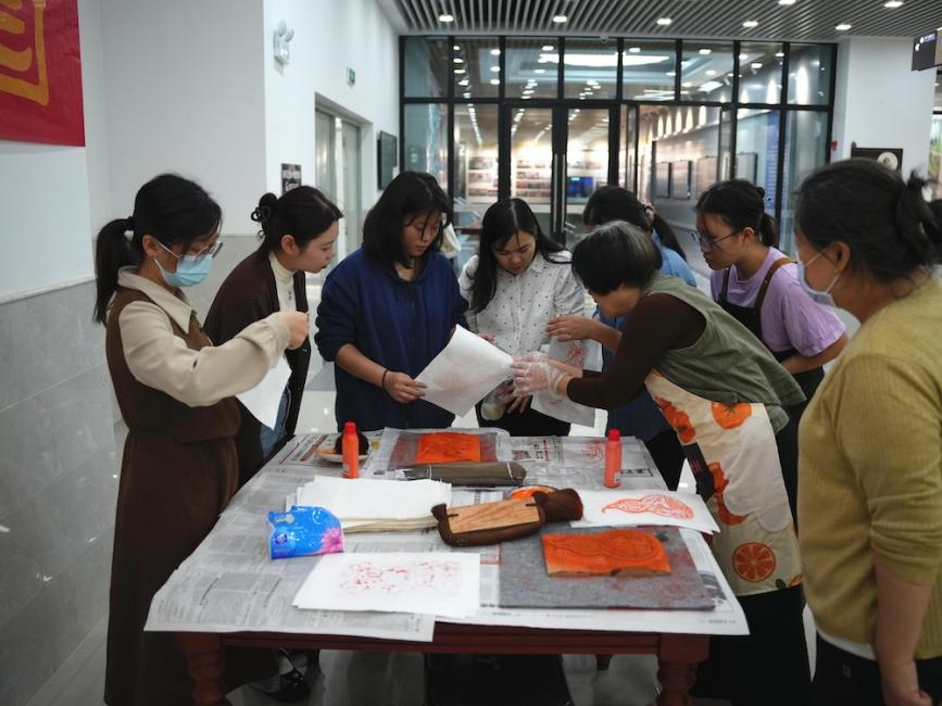 讲座的同时,在图书馆一楼大厅开展古籍修复体验,月100多名学生积极参与古籍修复雕版印刷的亲自体验。