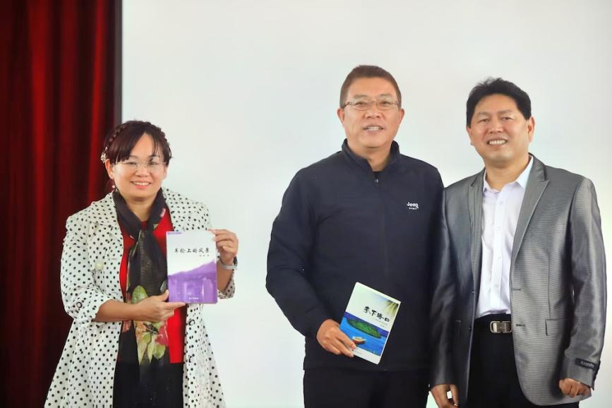 活动现场还上演了温馨的文化互动:海南师范大学书法教师颜以琳(颜鲁公四十世从孙)向彭桐赠送东坡名句书法作品《千山动鳞甲,万谷酣笙钟》,笔墨间尽展东坡诗文中的豪迈气象;作家泰来则捐赠了他与焦涌合著的新著《天容海色》,为东坡文化研究增添新助力。在互动提问环节,海南师范大学教授陈新、康养专家韩涛等就东坡饮食与运动的平衡等问题与彭桐深入交流,现场思想碰撞不断。