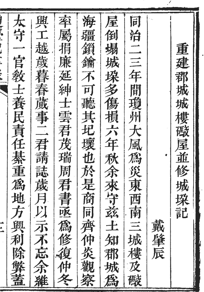 书中《重建郡城城楼炮屋并修城垛记》一文,则记录这样一件事:同治二、三年(1863-1864年),琼州遭遇大风灾害,郡城东、西、南三面的城楼全塌了,城垛也大多破损。数年后,戴肇辰来到琼州当知府,深知郡城城楼与城垛的重要性,不想任凭它破败下去,于是他带着下属们捐出自己的俸禄,又请绅士云茂瑞、周书两位先生牵头修复。同治六年十一月开工,次年春天就修完了。