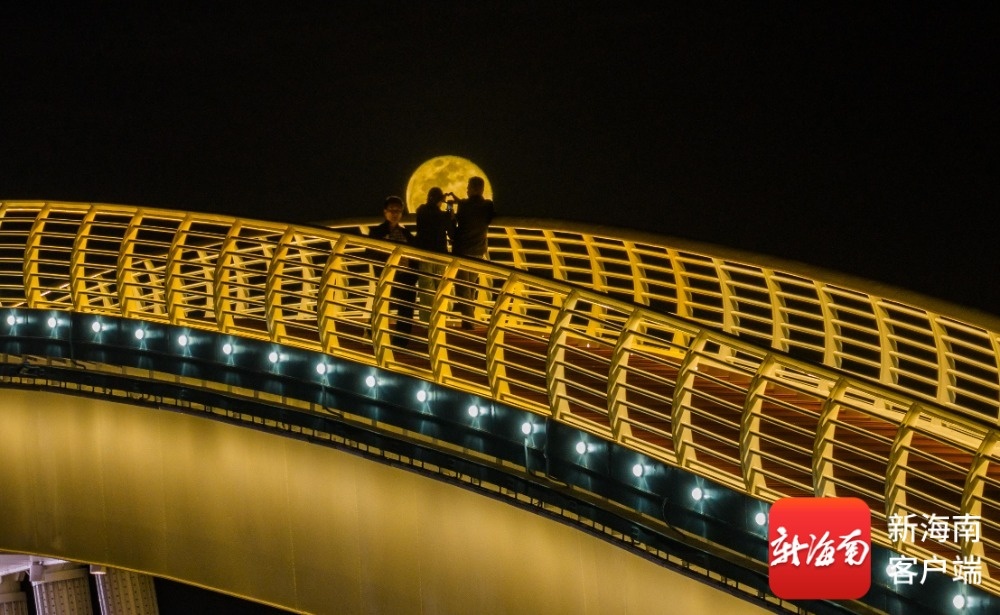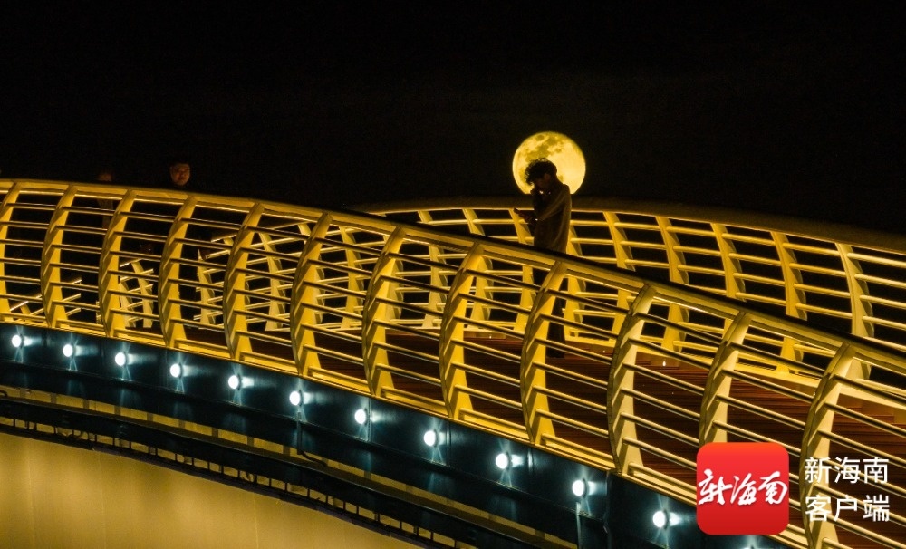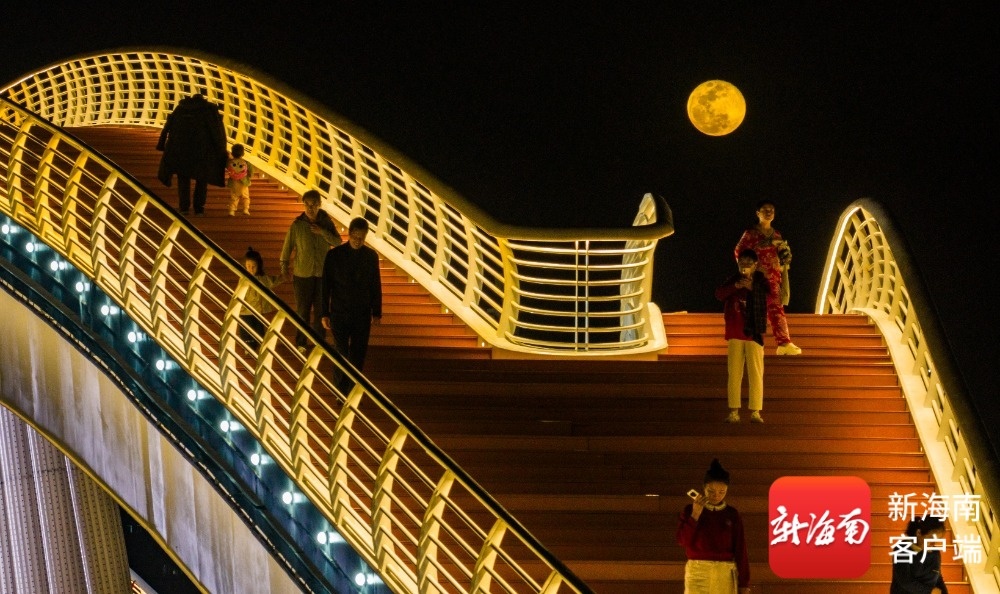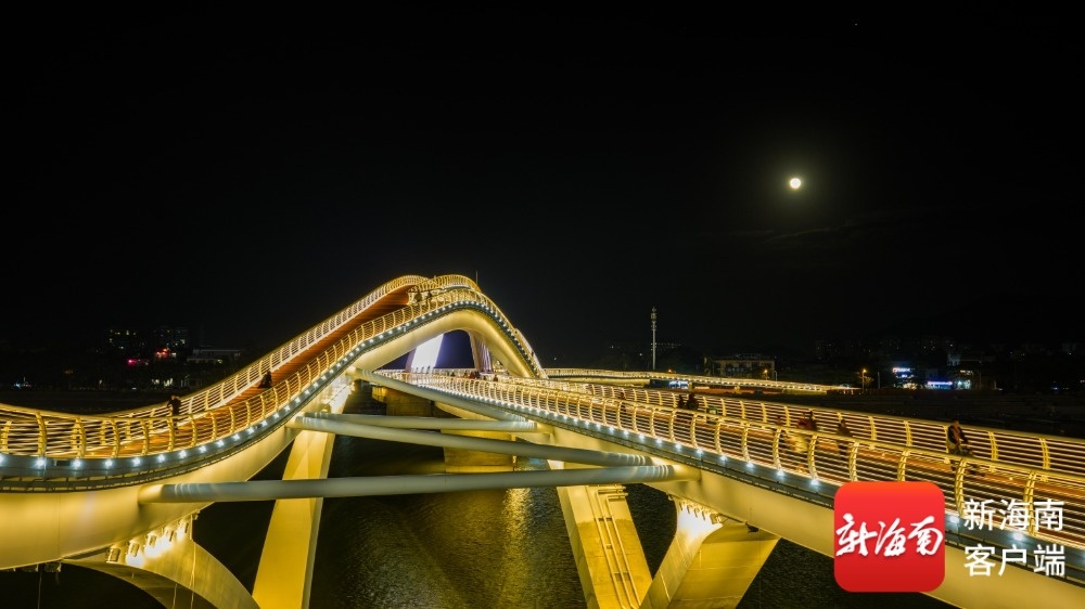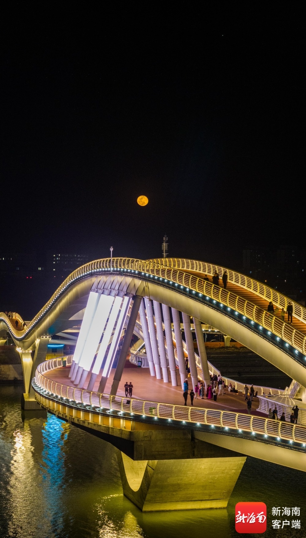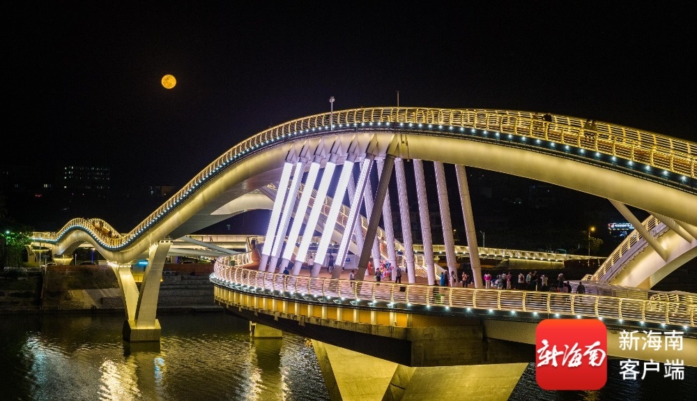 1月4日晚,陵水知音桥上,不少游人驻足游玩、拍照留念。农历十六的圆月缓缓升空,月光倾泻在河面上,波光粼粼中,桥影与月影相映成趣。
