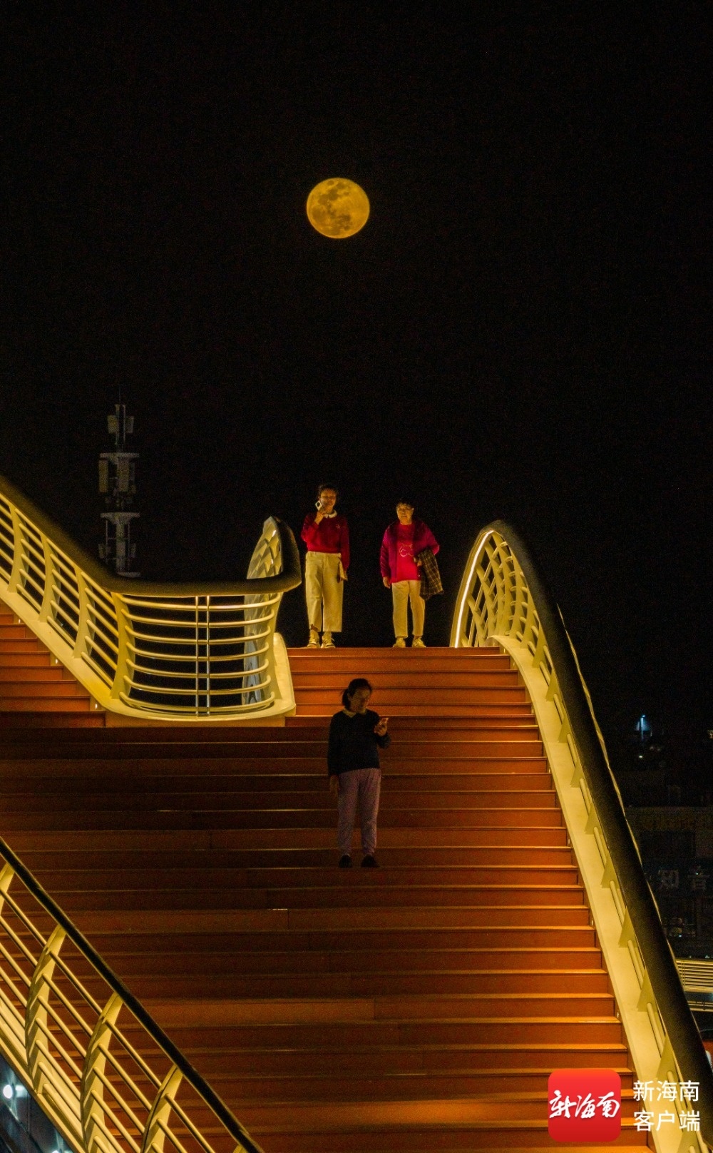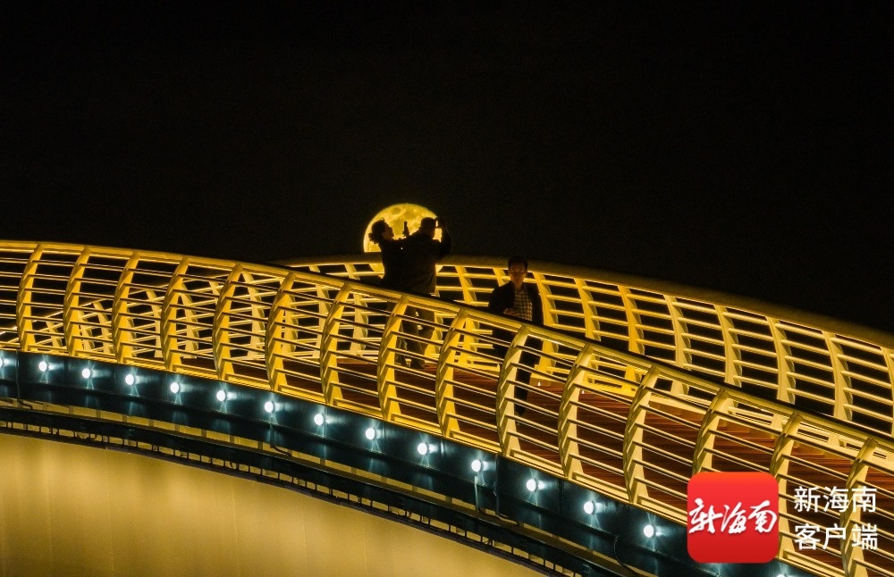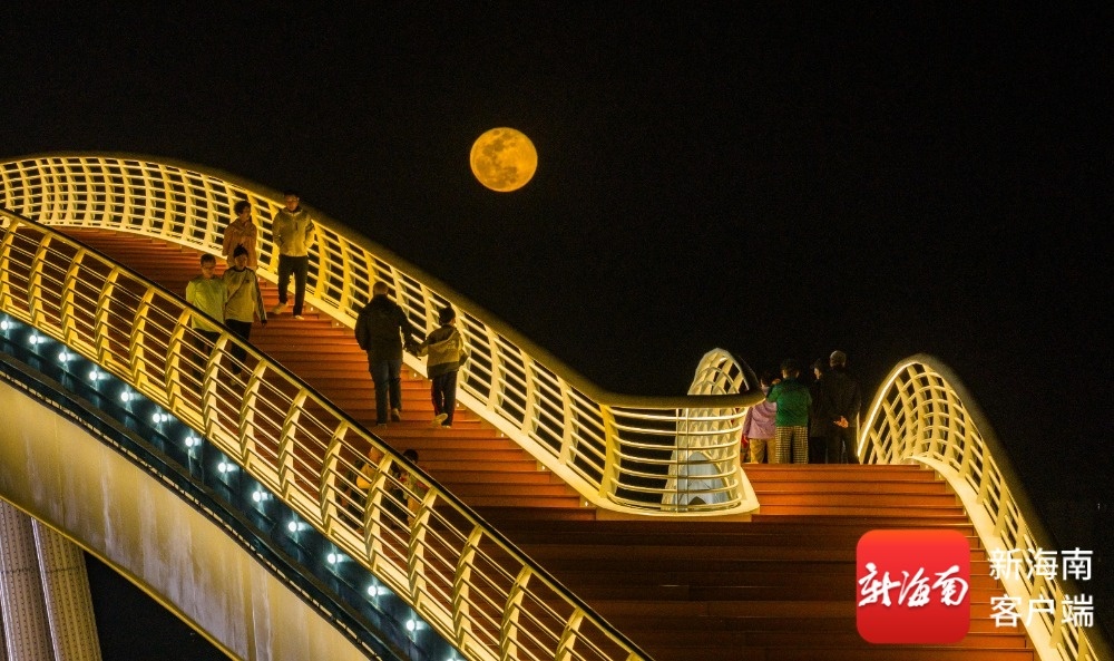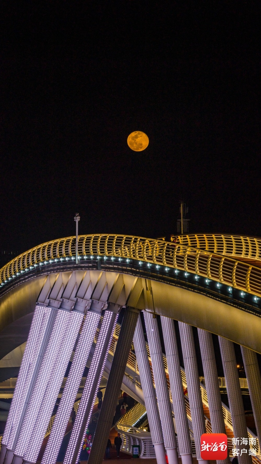 1月4日晚,陵水知音桥上,不少游人驻足游玩、拍照留念。农历十六的圆月缓缓升空,月光倾泻在河面上,波光粼粼中,桥影与月影相映成趣。