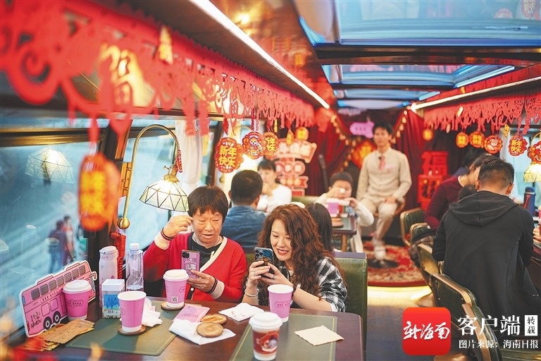 游客坐在老爸茶海口巴士上品尝美食,欣赏沿途美景。海南日报全媒体记者张茂摄