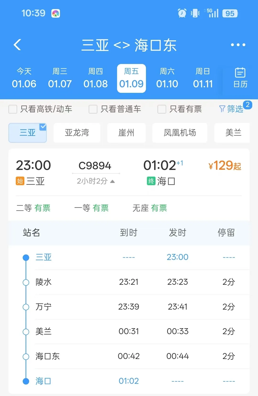 路线:三亚始发,经停陵水、万宁、美兰、海口东,终到海口,全程高效直达