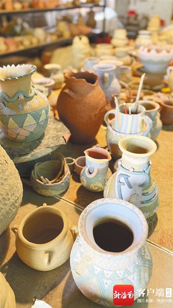 麦佳佳虽是婚后才开始系统学习制陶,但很有兴趣,上手也快。2025年,她和刘桂凤一起获评昌江黎族原始制陶技艺县级代表性传承人。如今,她7岁的儿子也经常跟着学习制陶。这温馨的亲子时光,仿佛当年刘桂凤与外婆、母亲相处的“重演”——非遗的种子,又一次在“玩泥巴”的童趣中悄然萌芽。
