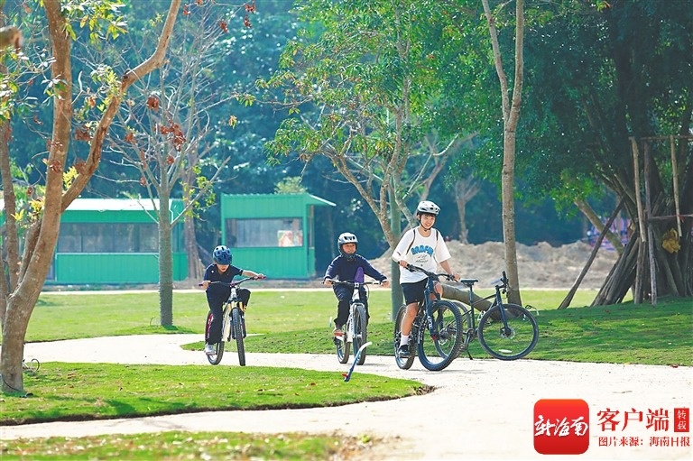 近日,午后阳光洒满万宁兴隆的开阔绿地,几名身着全套护具的孩子骑着山地车,在起伏的土坡上欢快练习抬压动作;不远处,工人正加紧修建未来的游客中心,山丘树林间,新辟的土路蜿蜒向上。这片充满生机的土地,正是即将于1月18日开园的兴隆自行车主题公园。
