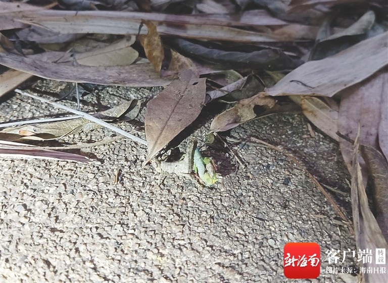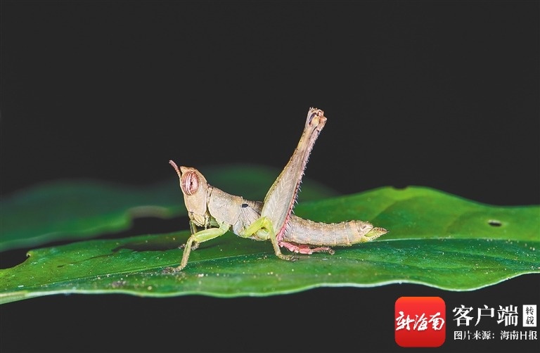 2023年7月,昆虫爱好者杨梓煊和师兄在黎母山进行野外研究采样,有一天他们在山上“刷夜”,走在海拔六七百米的一条雨林岔路上时,偶遇了一只趴在灌木叶片上“睡觉”的蜢科昆虫雌虫。“当时就觉得这只小虫子很特别,是个‘潜力股’,特意多留了个心眼。”杨梓煊回忆。