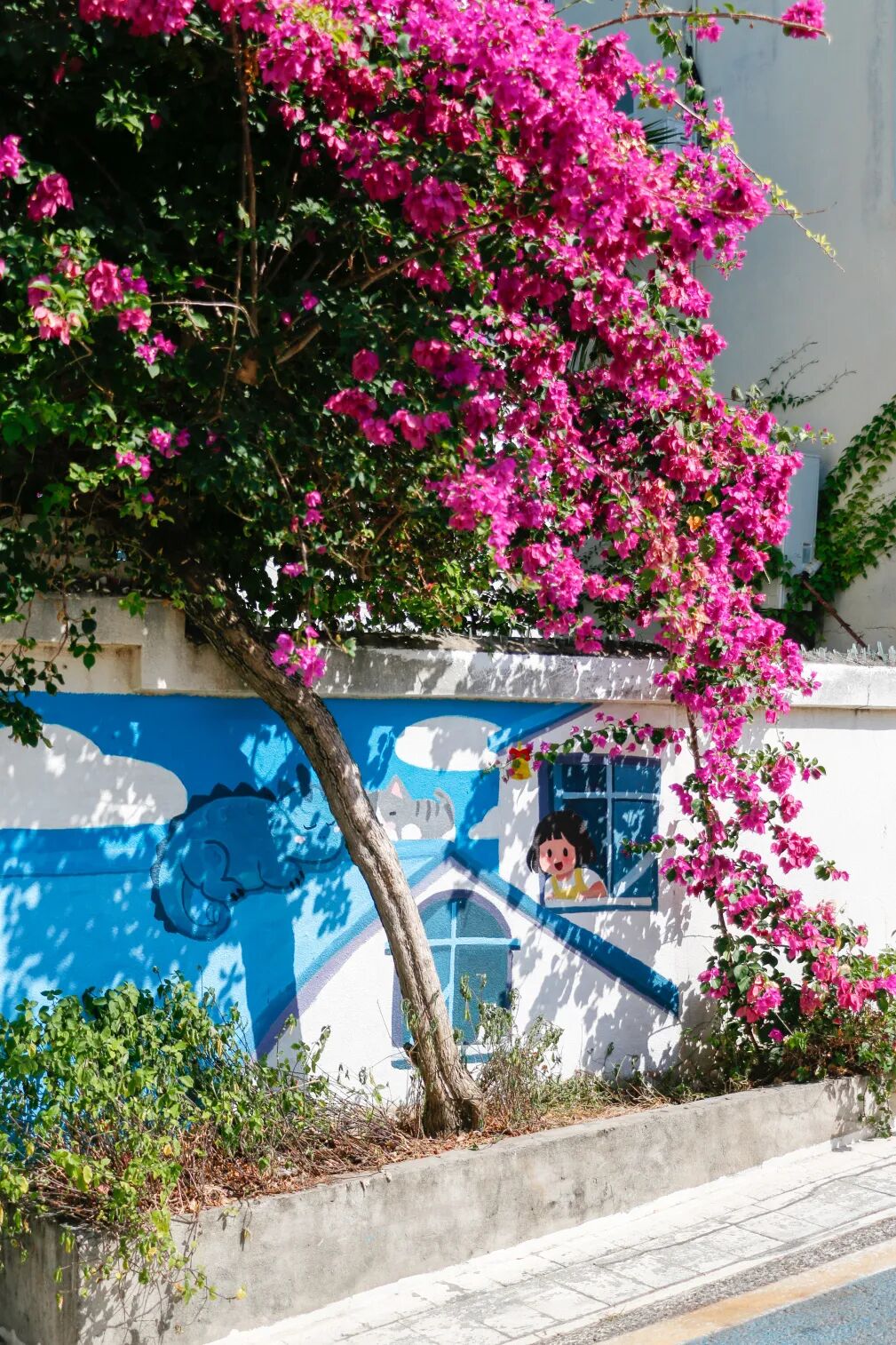 四处绽放的三角梅、童话般的壁画