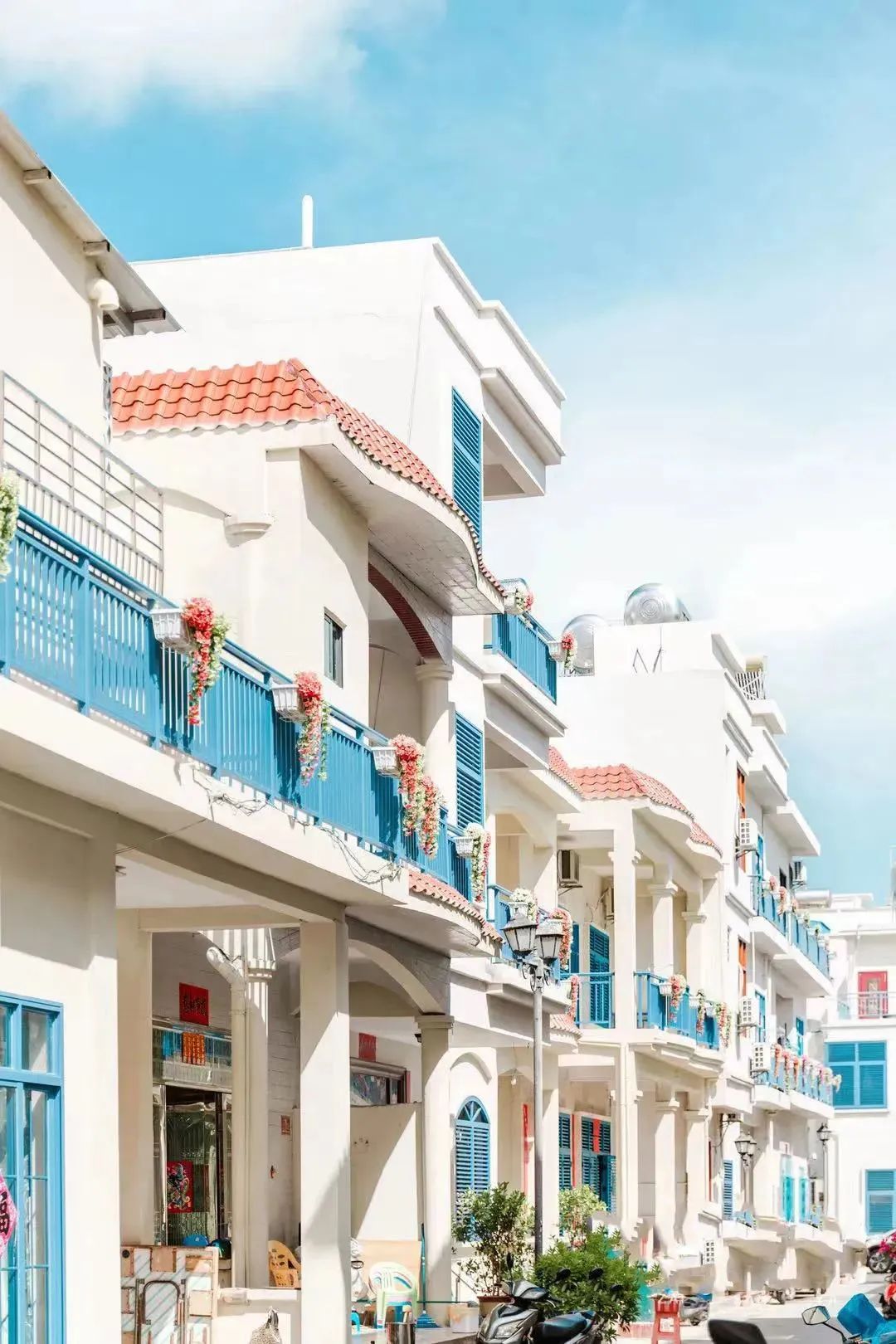 整齐的街道、统一的白墙、蓝色的门窗