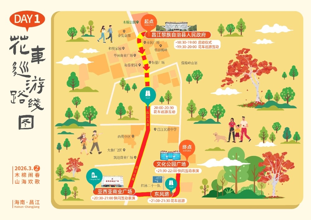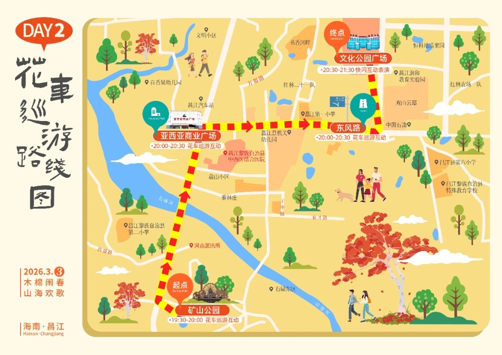 3月2日19时30分,多辆造型别致、主题鲜明的花车依次亮相,巡游队伍从昌江黎族自治县人民政府出发,沿昌江大道、人民北路、东风路缓缓前行,途经亚西亚商业广场、文化公园广场,最终抵达海钢广场。3月3日晚,起点则设在矿山公园,经亚西亚商业广场、东风路、环城东路,在文化公园落下帷幕。