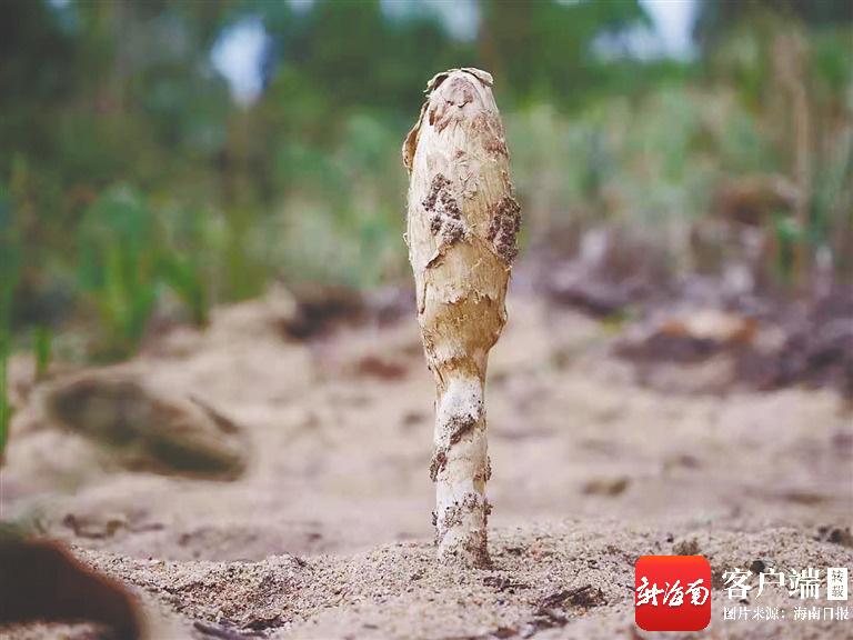 在海南西部地区,烈日炙烤下的海边沙滩上,温度高达50℃,沙子烫得或许能煎鸡蛋。这样酷热的环境下,一种奇特的蘑菇正在悄然生长。它的伞面始终闭合着,像一个害羞的孩子捂住了脸;但它个头不小,最高能长到23厘米。