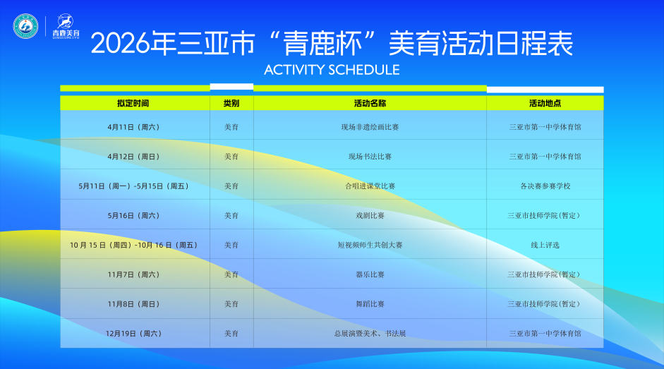 本次“青鹿杯”艺术展演活动由三亚市教育局主办,海南省演艺集团承办,以权威专业的赛事保障、成长导向的美育内核,为全市青少年搭建展示艺术才华、传承本土文化、绽放青春风采的优质平台。七大竞赛类目各有特色,从笔墨丹青到舞台展演,从课堂合唱到创意影像,全方位解锁青少年艺术潜能。更有开幕式、闭幕式两大重磅环节点亮全程,赛事流程精彩纷呈。