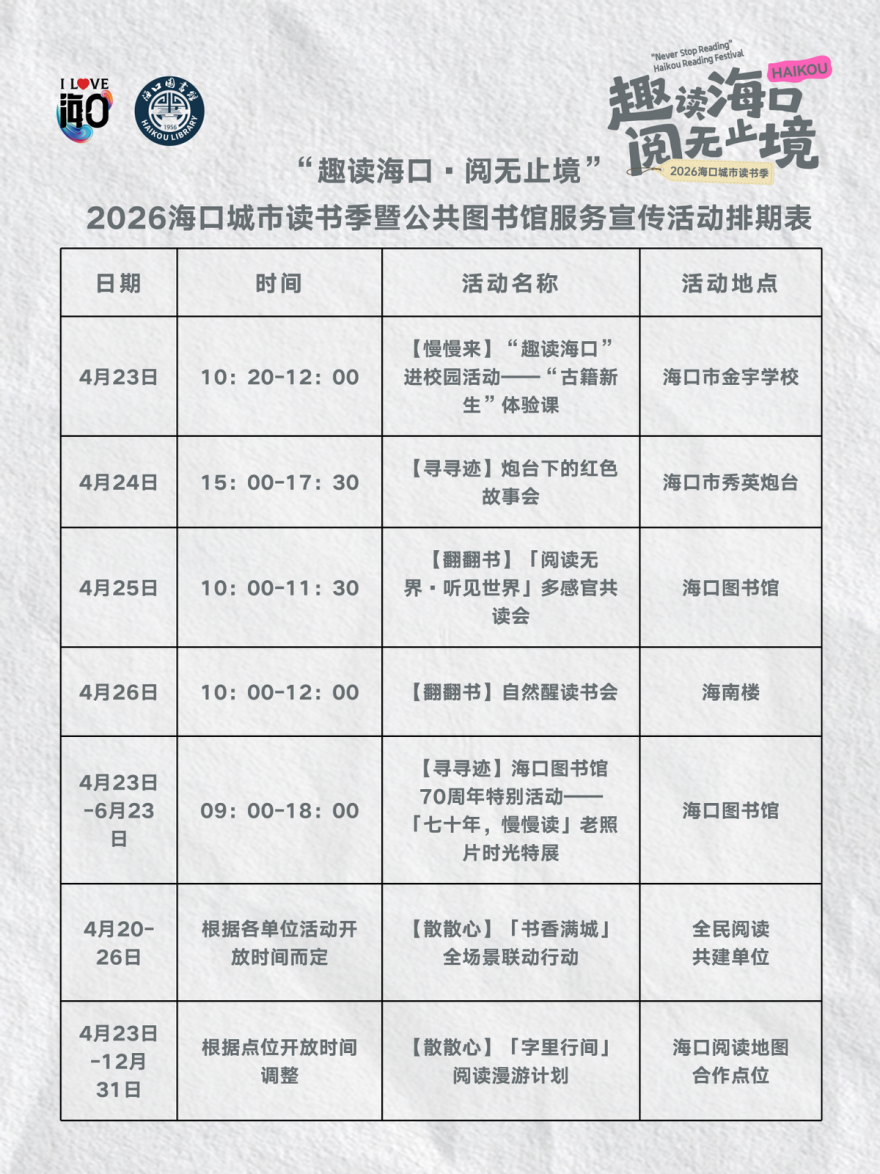 椰风海韵,书香满城。2026年,《全民阅读促进条例》正式施行,同时适逢海口图书馆建馆七十周年。值此首个“全民阅读活动周”暨公共图书馆服务宣传周之际,由海口市旅游和文化广电体育局主办、海口图书馆承办的“趣读海口·阅无止境”2026海口城市读书季暨公共图书馆服务宣传活动将于4月23日至26日在全城拉开帷幕。七十年书香浸润,这座城市的阅读文化地标正以崭新的姿态,为全民阅读的深入推广注入持久的温度与活力。