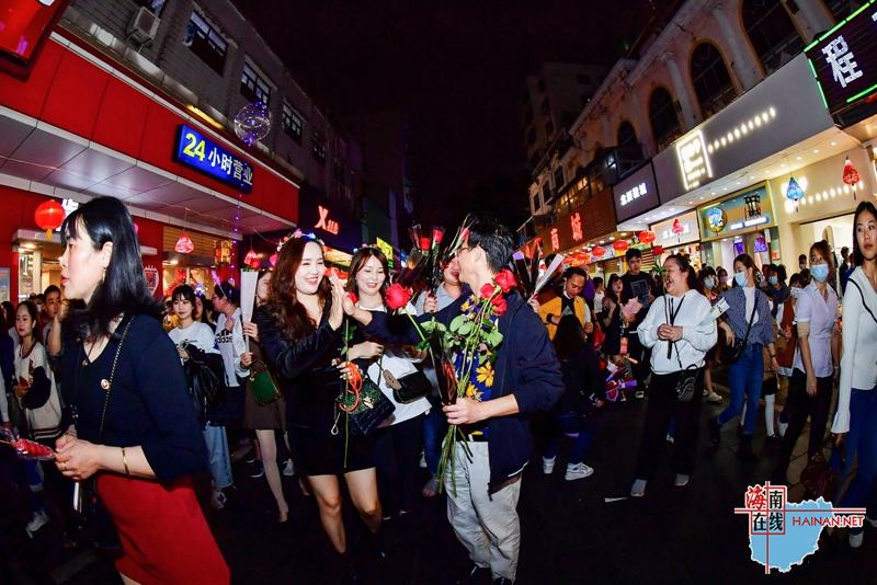 忠介路上,人们相互交换着手中的鲜花,表达着美好的祝福,欢声笑语不绝于耳。网络博主海南华哥同学微博直播,与天南地北的人们分享海南元宵习俗,带领网友近距离领略府城换花节的浪漫氛围,收获了众多网友的一致好评。