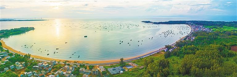 近日,俯瞰环岛旅游公路澄迈段,不远处的海面上,一艘艘渔船在落日的余晖下泛着金光。海南日报记者 袁琛 摄