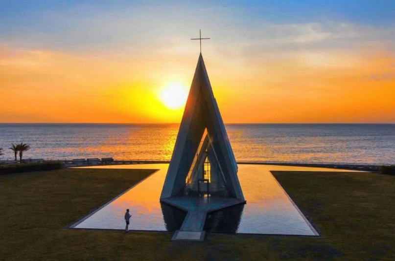 日月湾有座浪漫的礼堂伫立在海边,每天静静的站在海边看日升日落,阳光透过玻璃落下参差斑驳的光影,舒服、宁静、治愈、轻松。