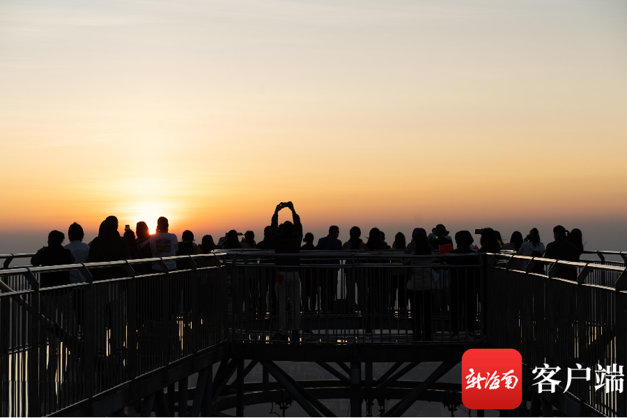 资料图:市民游客在呀诺达玻璃平台共同观赏“日出雨林,山海如画”的美景。