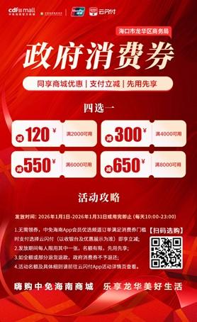 更值得关注的是,为进一步释放消费潜力,由海口市龙华区商务局主办的政府消费券活动将于2026年1月1日上午10时准时上线。此次活动将通过cdf中免海南APP会员优选频道发放百万政府消费券,以“政府补贴”形式直接降低消费者购物成本。