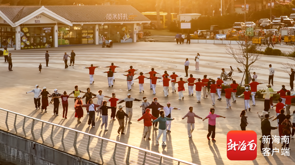 下午五点半,低空观光直升机升空,为游客开辟俯瞰美景的独特视角。机身掠过港湾,金色海面、穿梭渔船、连片渔排与岸边椰林尽收眼底,山海共长天一色的景致令人沉醉。沙滩上,游人或倚着椰树静赏晚霞,或踏着余晖漫步,咸湿海风裹挟着草木清香,吹散白日喧嚣。不远处的文化广场上,“候鸟”们伴着轻快旋律跳起广场舞,舞步蹁跹间,与海上渔火、天边霞光相映成趣,勾勒出最鲜活的暮日图景。